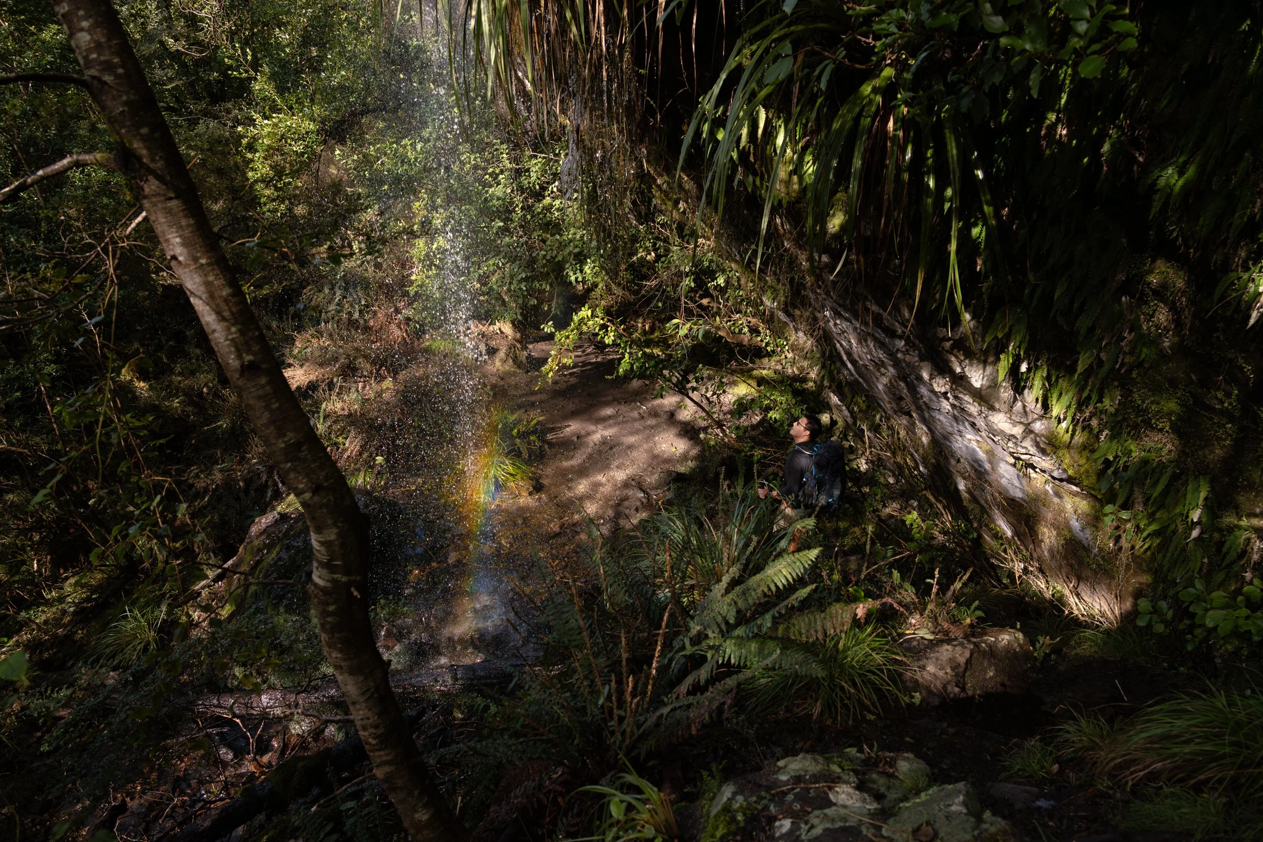 Eventually, we started zigzagging downwards, returning into the depths of the bush. I led myself into the false belief that the tramp was coming to an end. I was delighted to discover I couldn’t have been more wrong. We stumbled upon a series of temporary waterfalls, with the light reflecting through the bush perfectly. There was one instance where Rayson walked behind a cascading waterfall, and the light began to weave through the droplets, erupting into a rainbow. Lasting less than a minute, I managed to hoist my camera out and capture the moment.